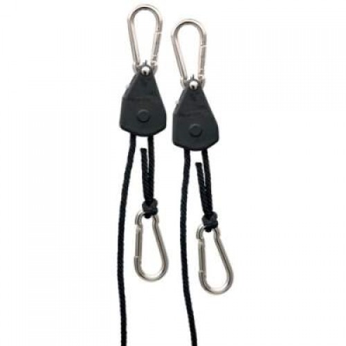 Sky Hooks are manufactured by the original Sun Grip factory. Their proven reliability and ease of use has made them the leader in the Light Hanging category. Sky Hooks are an economical version of the Sun Grips, with a slightly reduced weight capacity. Their patented system pulls tight, locks in place and when used as directed, will never break, slip or rust. Heat and cold resistant. 8 feet of braided polypropylene rope. Carabiner clips provide secure hold. Great for hoisting or securing reflectors, light fixtures, smaller carbon filters and ventilation equipment. Maximum weight capacity is 40 lbs each (80 lbs per pair).