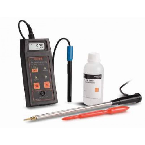 This instrument was designed to address the need for fast and accurate conductivity measurements in soil and liquids. It is supplied with two probes: a stainless steel, conical tip for direct soil measurement and one for fertilizer-enriched solutions.