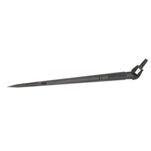 This angled dripper stake fits 1/4 in irrigation tubing and has a 45 degree angle to reduce sharp bending of the tubing, which causes clogging. It delivers a light emission of water for regular top drip irrigation.