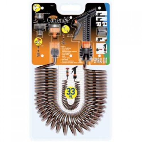 This Italian-made coil hose quickly deploys for outdoor watering uses. With hose extendable up to 33-feet, always retracts to its original shape after use for organized and convenient storage. Made of thermoplastic polyurethane compound, the hose has excellent flexibility properties and resistance to abrasions and kinks. The trigger action spray nozzle has a powerful jet spray ideal for spot watering or cleaning up after planting and the back trigger allows water flow control; complete with quick-click hose adapter which features a water-stop for automatic water shut off when nozzle is removed from the hose. Spray nozzle wall mount not only keeps your area clean. The Kit also includes nozzle aerator accessory for gentle stream spray and 3 faucet adaptors to accommodate most of utility faucet styles. Operates with pressure as low as 14.5 PSI up to 58 PSI; handles water temperature up to 104
