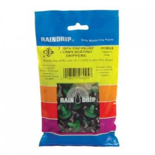 Raindrip's turbulent flow PC (pressure compensating) drippers maintain their rated flow rate for 10-60 psi inlet pressure. These drippers can be used at the end of 1/4 in tubing feeders or can be inserted directly into 1/2 in Raindrip hose. Ideal for light soil (sandy).