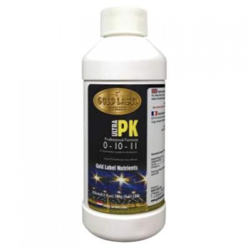 Gold Label Ultra Pk is a flowering additive based on advanced polyphosphates and chelated trace elements. Ultra Pk has been specifically developed to perfectly balance your NPK and micro elements in all stages of vegetative and generative development. The Ultra Pk formula prevents phosphorus from depositing at pH levels >6.2, promotes availability of Ca, Mg and trace elements and keeps your drip lines clean. Use in combination with all Gold Label Base Nutrients, 0.5 ml