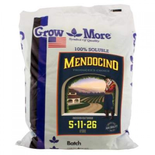 Grow More's Mendocino Producer's Choice line of fertilizers are the most advanced powders we've ever created. They are 100% water soluble formulas containing a properly balanced mixture of all essential plant nutrients with quality-enhancing elements; calcium, magnesium, DTPA/EDDHA Iron, carbohydrates, amino acids and no artificial dyes or colorings. This Mendocino line provides highly efficient, performance nutrients as a standalone base nutrient or as a vegetative and bloom stimulant. For use in soilless, hydroponic, organic soils and coco coir systems. Special soluble non-acidifying sulfur provides increase in chlorophyll formation and availability of potassium. High rainfall or excessive irrigation can cause sulfur deficiencies. Magnesium helps transport phosphate in the plant and is essential in chlorophyll.