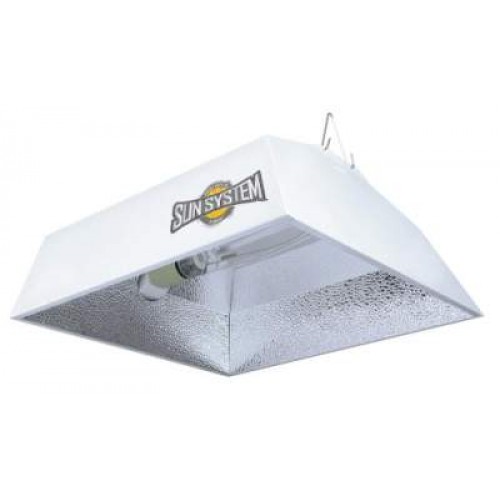 Integrated socket and 15 ft lamp cord. Powder-coated galvanized steel housing. Highly reflective aluminum reflector offers excellent diffusion properties. This is a non air-cooled hood that does not accept glass.
